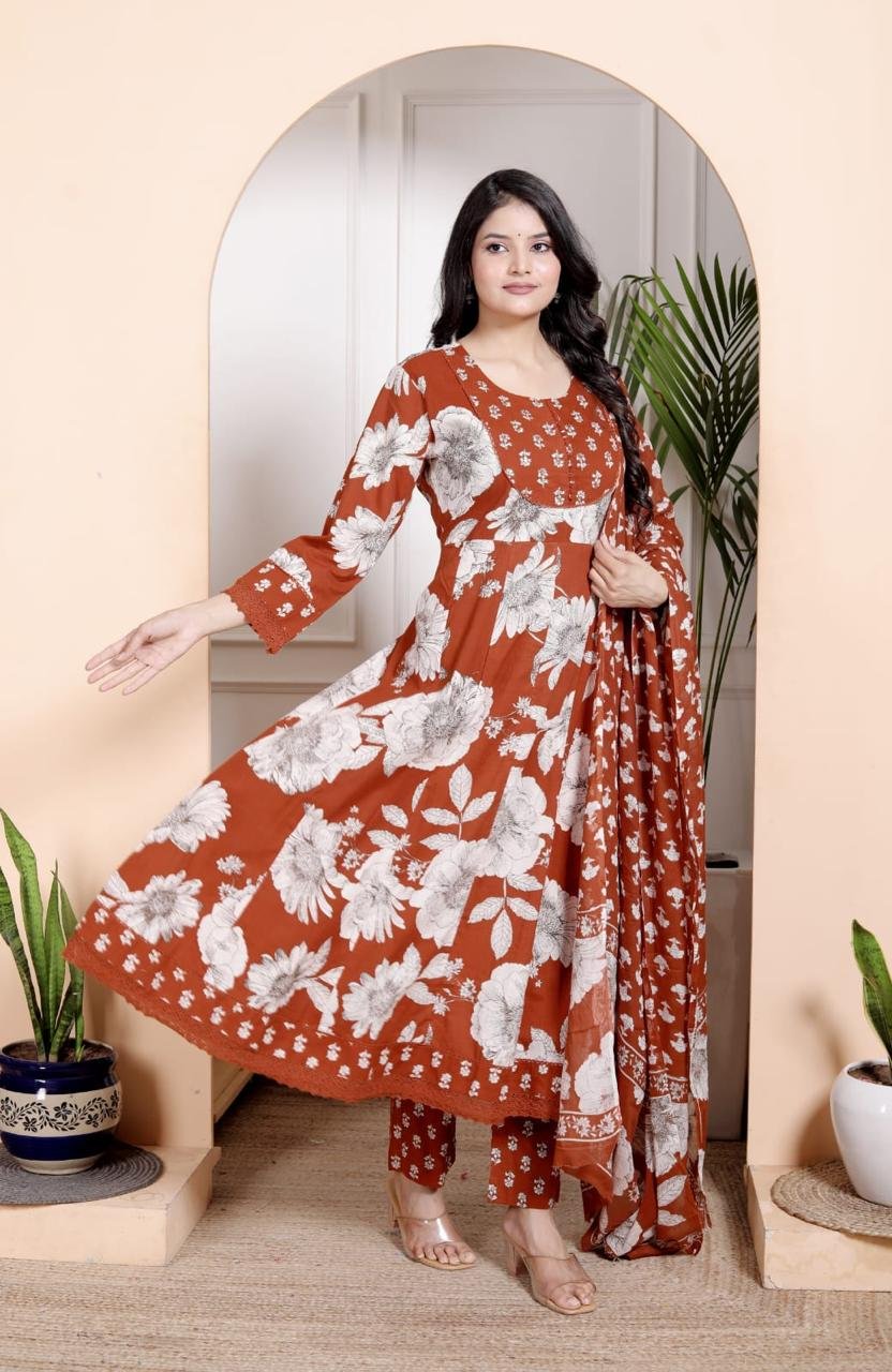 Printed Three-Piece Kurta Set – Rust & White Floral