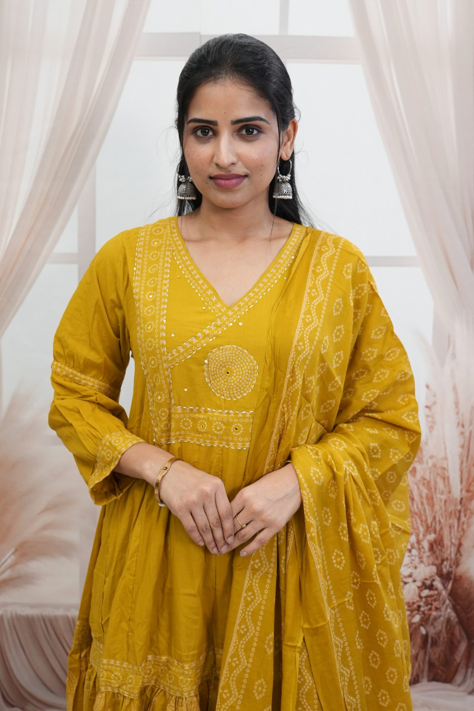 Be the first to review “Golden Yellow Tiered Anarkali Kurta Set” Cancel reply
